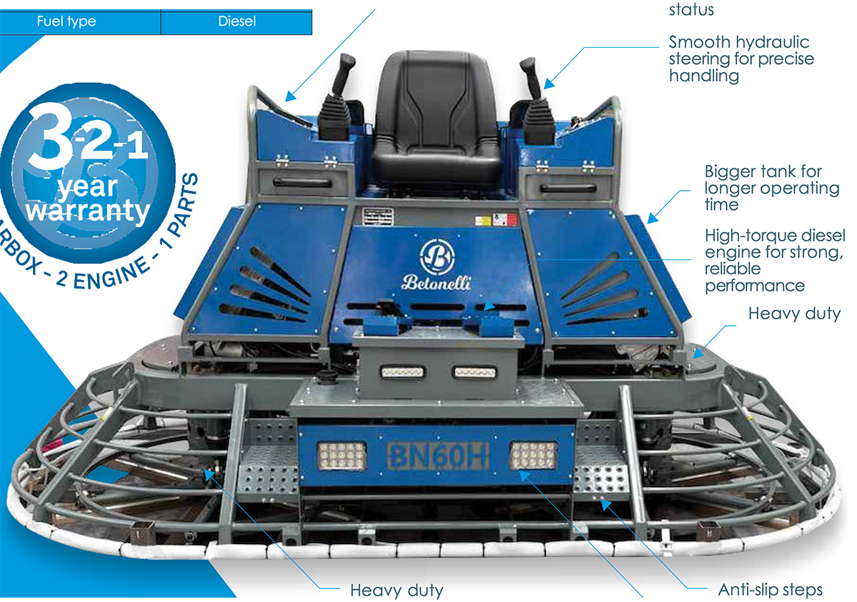 Built for scale and speed. The BN60H is engineered for expansive pours, combining massive coverage with smooth ride-on control—helping crews finish faster while maintaining superior surface flatness on large commercial projects.